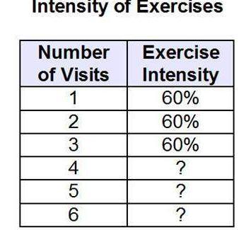The table (in figure) represents the recommended exercise intensity for the aerobic program based on the number of visits since the beginning program recommends a consistent intensity for three visits increase in intensity over three visits then decreasing intensity for three visits before restoring the pattern which set of values could be the intensity of embers exercise during the fourth fifth and six visits check all that apply