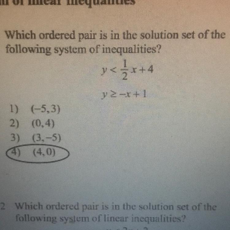 The point on the dashed line is not in the solution set. The only point in the doubly-shaded area is (4, 0), choice (4).