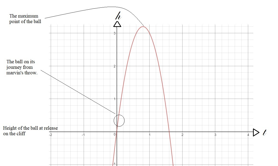 after exactly 5 seconds after releasing, the height of the ball was -85 metres.This suggests that the ball went upwards vertically, reached its highest point, and then fell downwards, passing the edge of the cliff where Marvin stood and goes down below the edge of the cliff (where it was released) by 85 metres, hence the - 85 metres.c) assume that the top of the cliff is represented by h = 0; that is when the height of the ball is at the edge of the cliff, thus not above or below but at the height of 0.