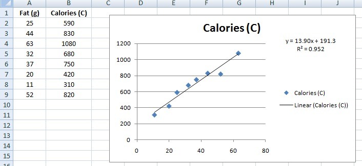 We have been given a table of fat contents and calories for the burgers at a fast food chain.