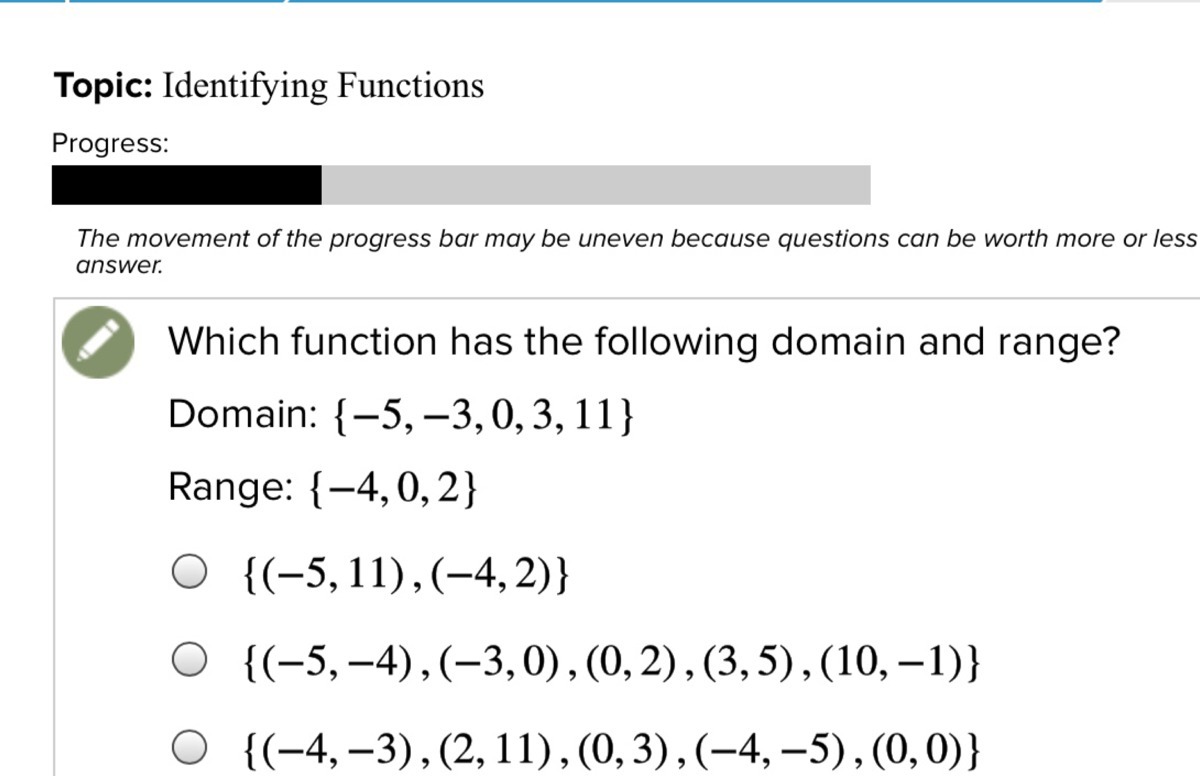 Given the domain, {-5, -3, 0, 3, 11} and the range, {-4, 0, 2}, none of the answers given above fit into the given domain and range.
