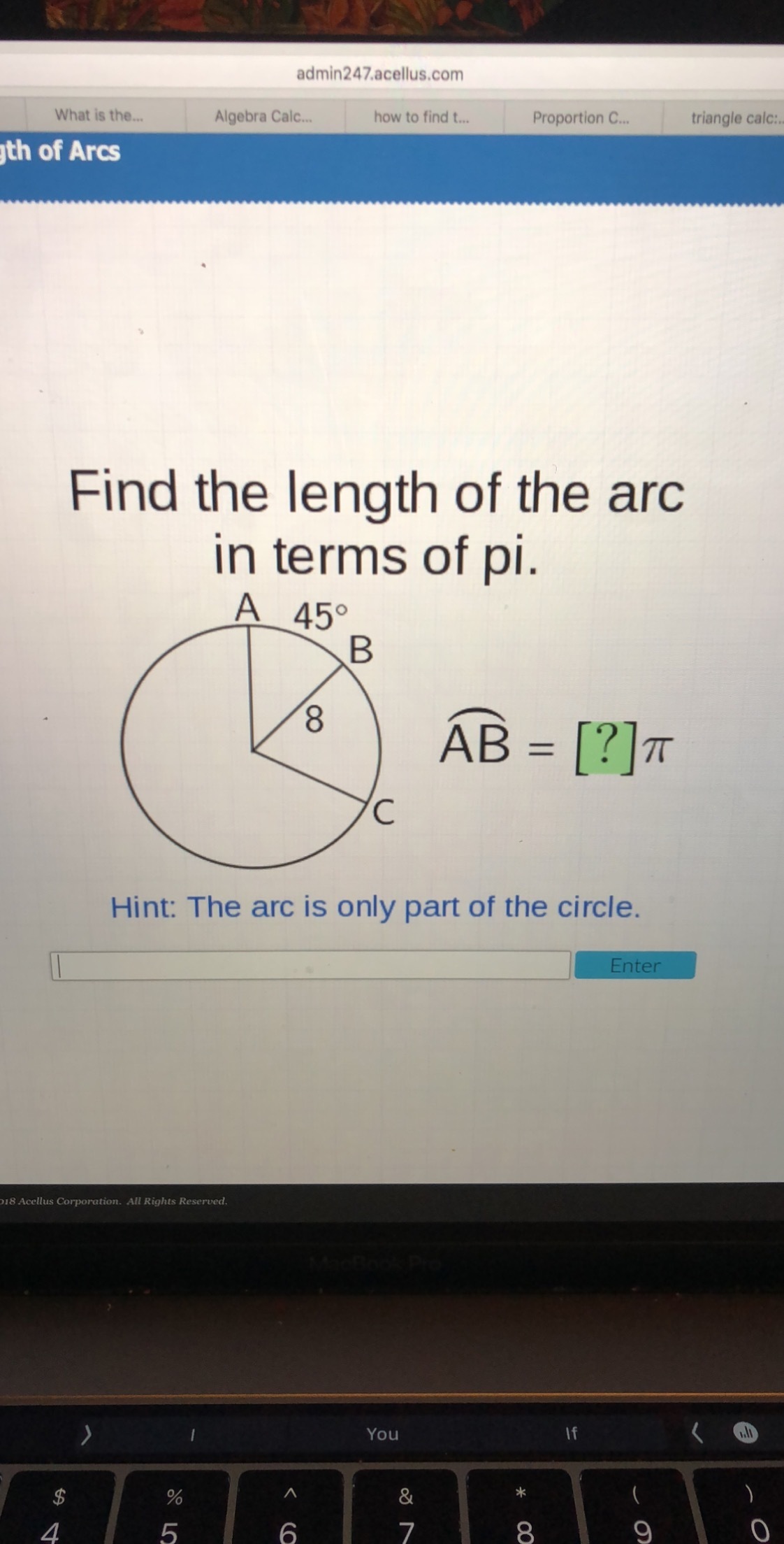 We can clearly see that the radius of the circle is 8. However, no central angle is given to us. However, we can see that the measure of arc AB is 45°. This means that the central angle of arc AB is also 45°. (Remember that the measure of arc is the same as the measure of its central angle.) Converting 45° to radians, we get .