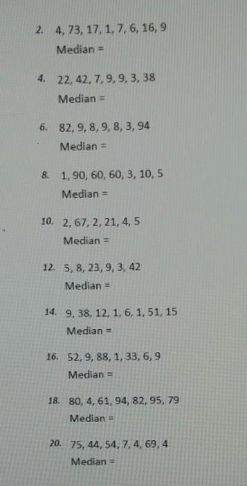 1, 4, 6, <u>7, 9, </u> 16, 17, 73 = 7+9/2 = 8 3, 7, 9, <u>9 </u>, 22, 38, 42 = 9 3, 8, 8, <u>9 </u>, 9, 82, 94 = 9 1, 3, 5,<u> 10 </u>, 60, 60, 90 = 10 2, 2,<u> 4, 5 </u>, 21, 67 = 4+5/2 = 6.5 3, 5, <u>8, 9 </u>, 23, 42 = 8+9/2 = 8.5 1, 1, 6, <u>9, 12, </u> 15, 38, 51 = 9+12/2 =10.5 1, 6, 9, <u>9, </u> 33, 52, 88 = 9 4, 61, 79, <u>80 </u>, 82, 94, 95 = 80 4, 4, 7,<u> 44, </u> 54, 69, 75 = 44 Pretty sure they are all correct so plz give me brainliest:)