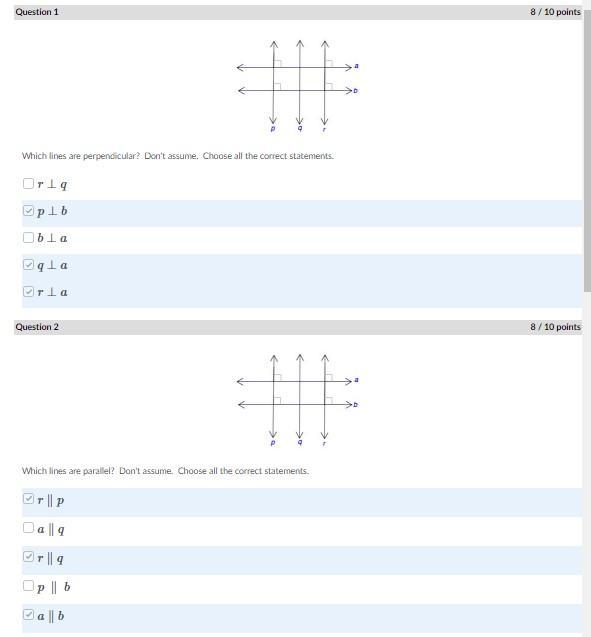 Lines p and r are parallel, as are lines a and b. Either of the lines in one parallel pair is perpendicular to the lines in the other parallel pair. Line q has no necessary relation to anything, so can be ignored. (No answer containing q can be correct.)