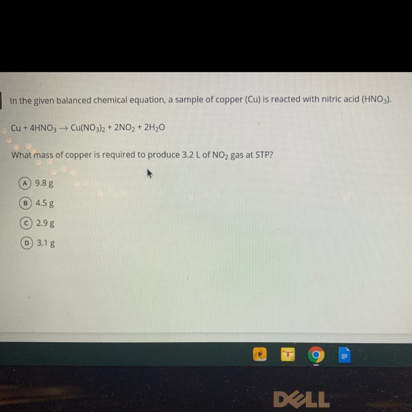 The molar ratio of Cu to NO₂ is 1:2. The moles of Cu needed are 1/2 × 0.14 mol = 0.070 mol.