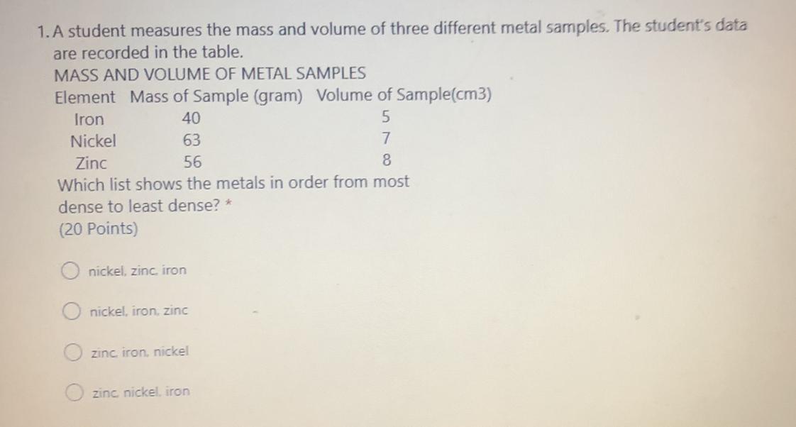 B nickel, 8.9 g/cc, iron, 7.87 g/cc, zinc 7.13 g/cc