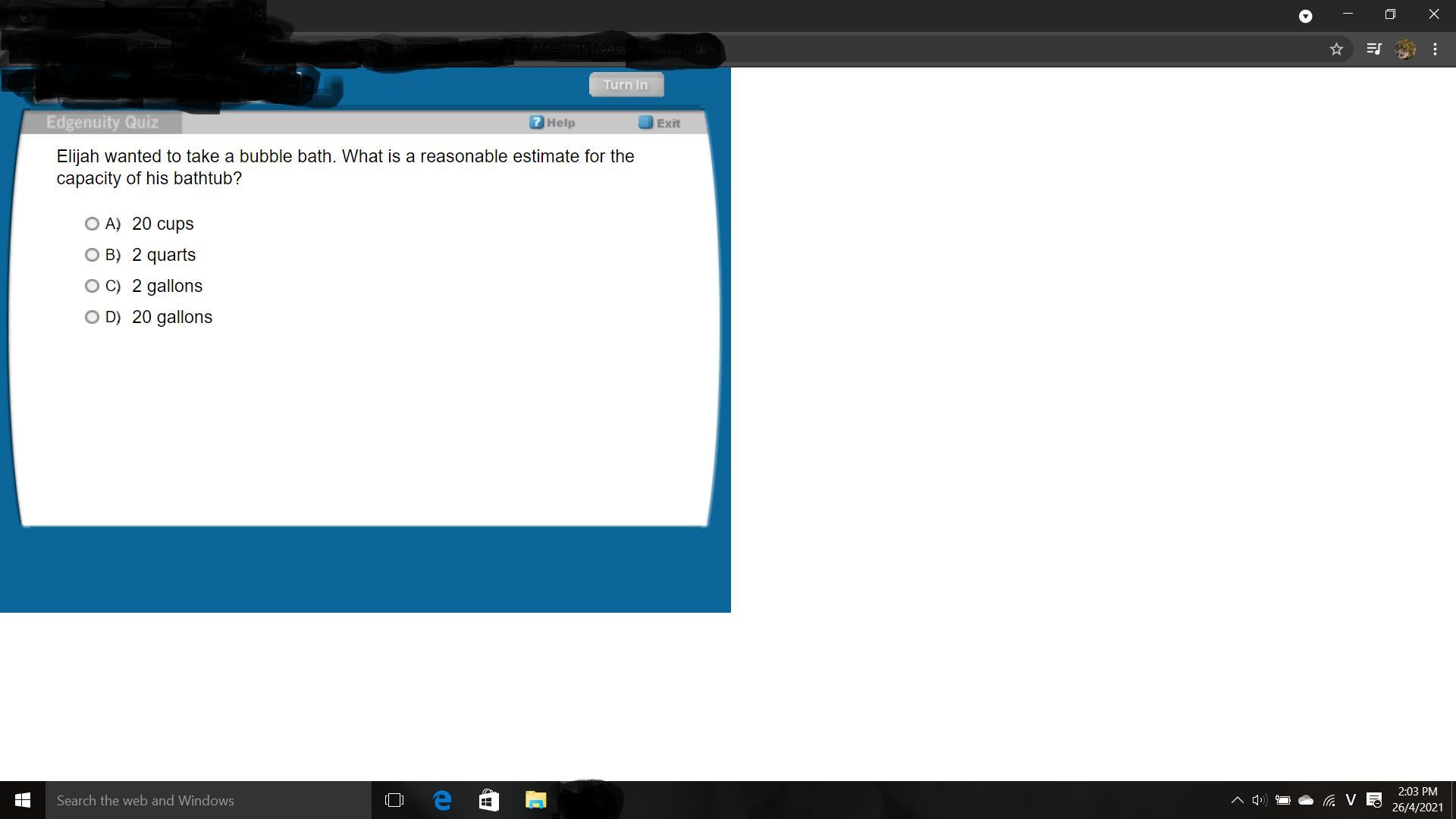 Looking at the options, the best estimate for Elijah’s bubble bath is 2 gallons.