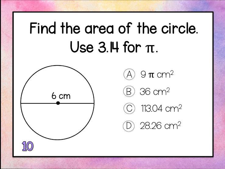 This figure is made up of two shapes: A square, and a semicircle, or half circle. Since it is half of a circle, we need to calculate the area of a circle, and divide by two. The problem gives us a diameter of 6, which we know we must divide by two because a diameter is twice the size of the radius, and the formula is radius^2*pi. Divide 6 by 2: