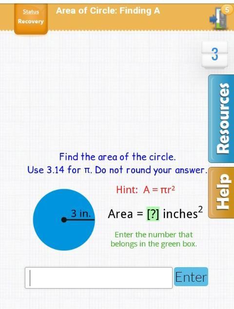 You want to plug everything in to the equation that you can. It says that pi=3.14, and the radius (aka r) is equal to 3. Therefore when plugging everything in, the equation reads (3.14)(3)^. ^ means squared, its the tiny 2 above the r. when something is squared it means you multiply it by itself 2 times. therefore 3 squared = 3 x 3= 9. After finding out 3^=9, the equation reads (3.14)(9). Now all you have to do is multiply the 2 together which results in 28.26.