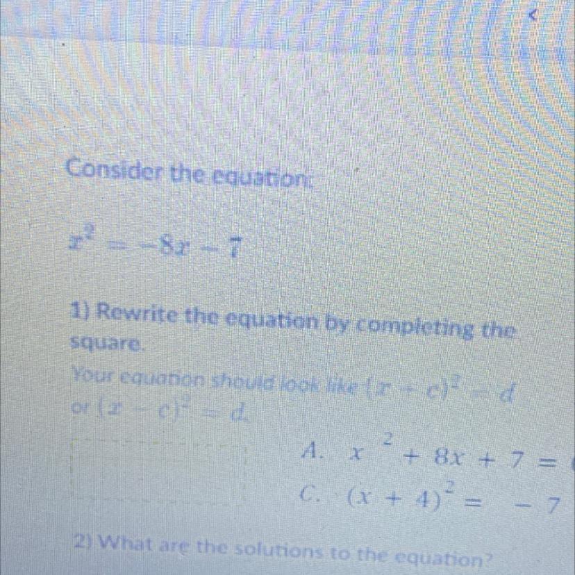 Re-write the equation as x^2+8x+7 = 0. We know x^2+8x is (x+4)^2 = x^2+8x+16, so we add 16 to both sides.