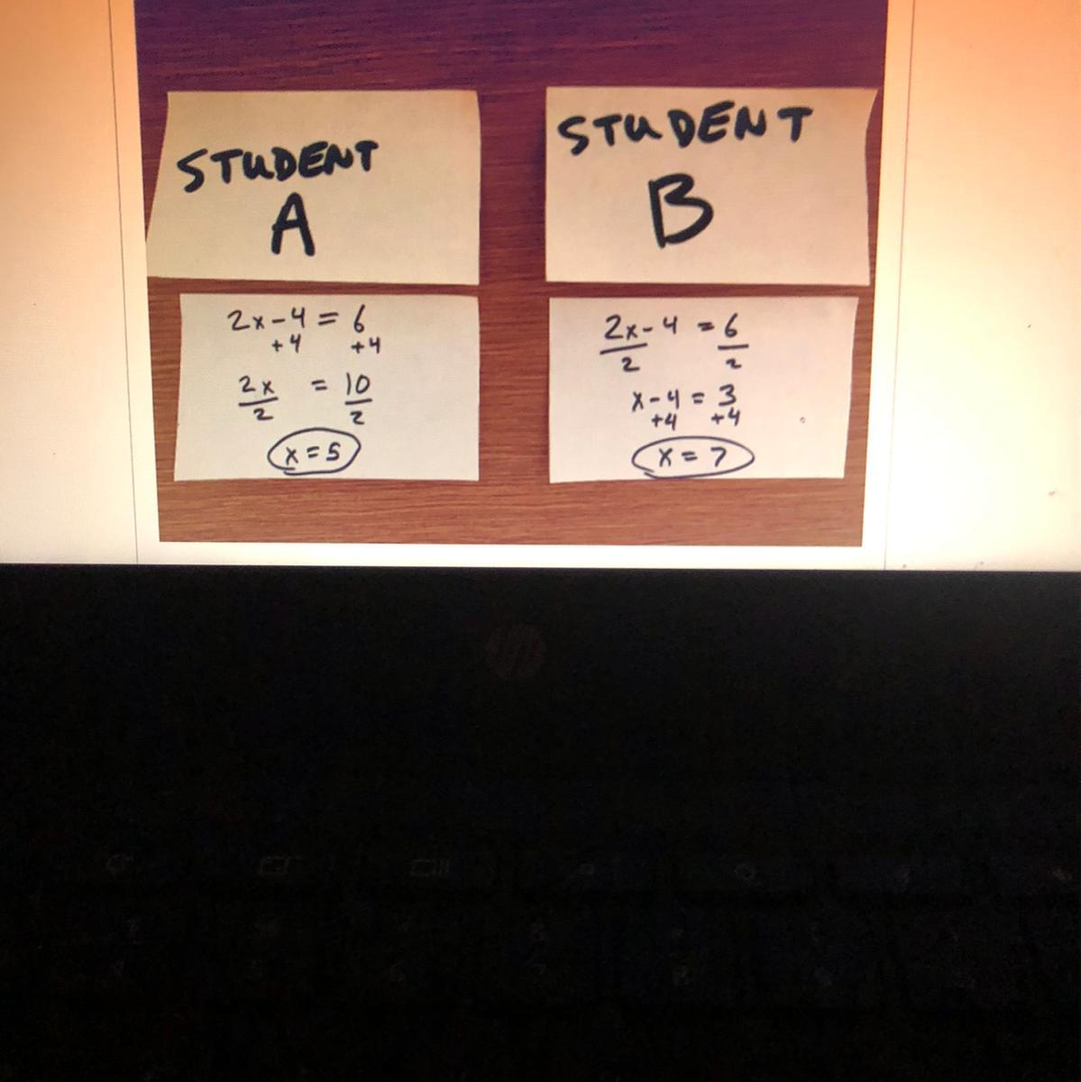 Please I NEED HELP AS SOON AS POSSIBLE! Two students were given the same problem of 2x - 4 = 6 to solve . Student A got an answe