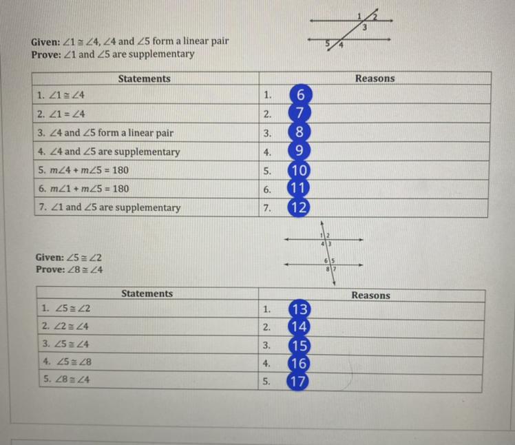 Prove angle 1 and angle 5 are supplementary. Prove angle 8 and angle 4 are congruent