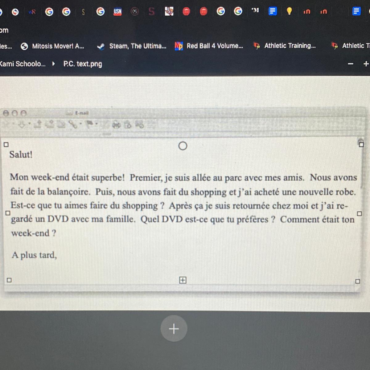 <u>Ma mère va à la boucherie</u> pour acheter des steaks et du poulet. Ma sœur et mon frère vont à la bibliothèque pour chercher des livres. Moi, je vais à la banque pour changer des euros pour mon voyage en Amérique. Après, <u>nous allons à la piscine</u> pour nager.