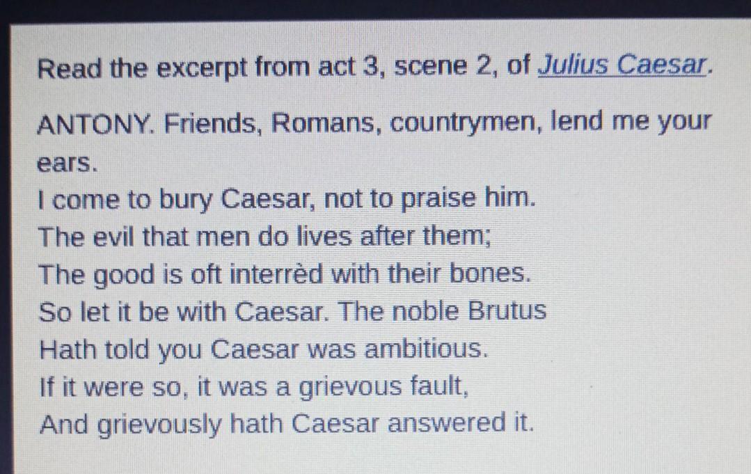 ny does not believe that Casar deserves a funeral but unwillingly agreed to speak to please the conspirators The mistakes men make are remembered after their deaths, but their good deads more often die with them. O If Caesar was power-hungry, it was a serious flaw, and he paid seriously for it. Antony betieves the conspirators should be rewarded with riches for their sacrifice and willingness to kill the ambitious Caesar.