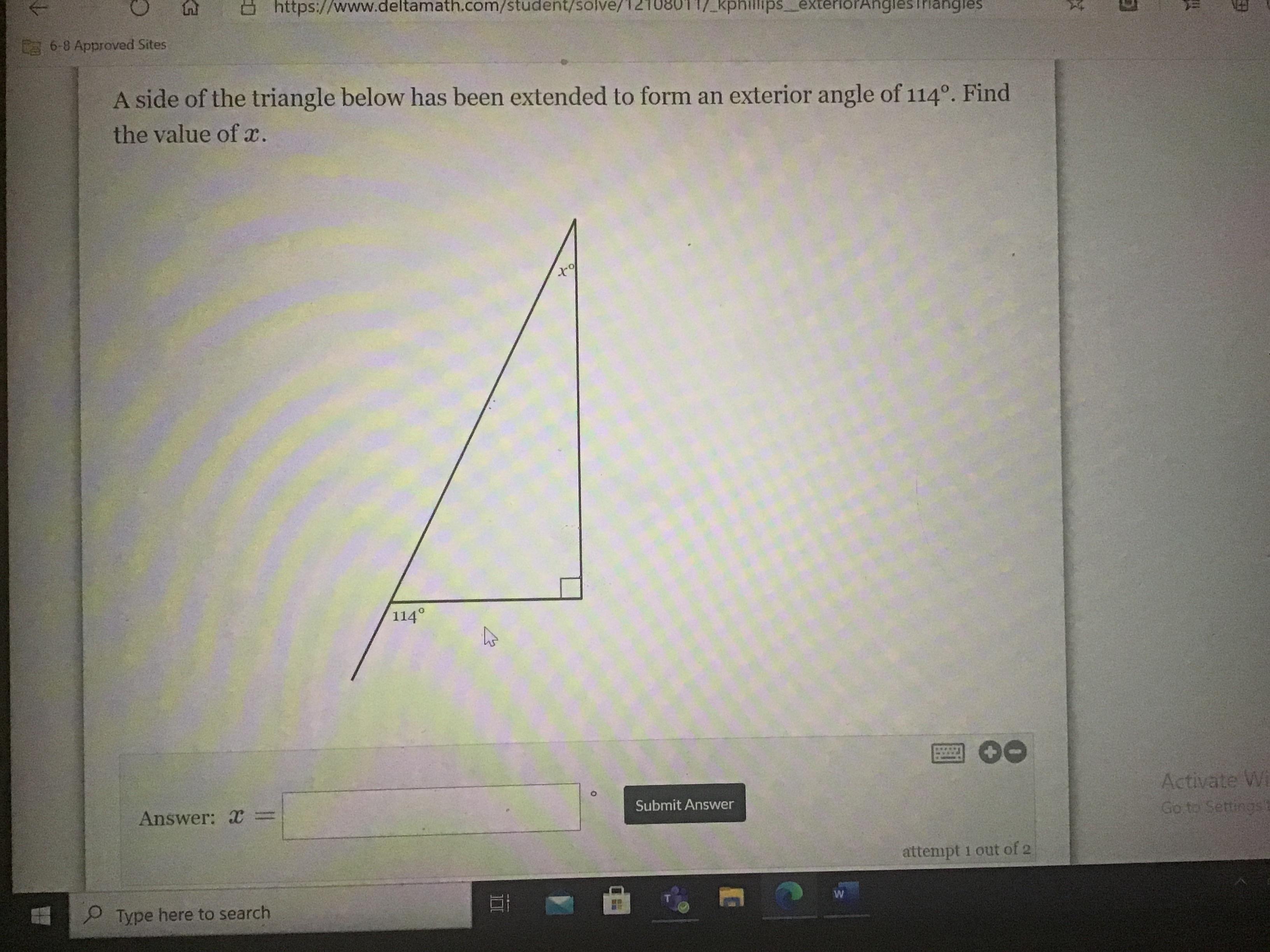 This is a right triangle so you know the bottom right angle is 90 degrees.This is geometry it seems so left side you are given the numerical value 114 and as you know a straight line in correlation with shapes usually means its 180 degrees so 180-114 is 66 so that means the bottom left angle is 66 the bottom right is 90 and since a triangle sums up to 180 degrees you subtract the 2 angles from 180 to get 24