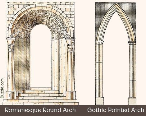 Gothic architecture evolved from the Romanesque style. It came about the 12th century. One of the most important differences between these two styles is that the Gothic style allowed for buildings to be taller. This allowed for stained glass windows to be larger, which then allowed more natural light into the structure. Gothic architecture utilizes flying buttresses and minimal structural support. One of the easiest ways to tell the difference between Gothic and Romanesque is be looking at their arches. Pointed arches were found in Gothic architecture while Romanesque featured rounded arches. The image below shows the difference between the two styles.
