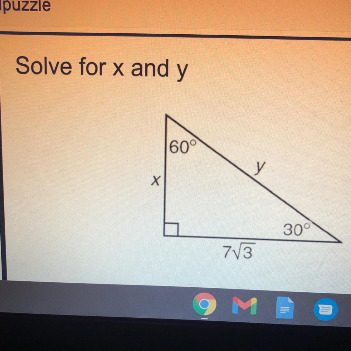 this is a special 30-60-90 right triangle bc there is a right angle marker and a 60 degree and 30 degree angle