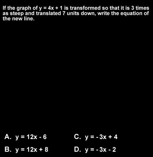 So we know that the slope is 4, and we want to make it 3 times as steep, so that would be 12. The y-intercept is one and we want to move it down 7 units, 6-7= -1. So our final answer would be y= 12x-6!