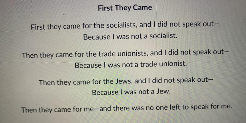 The author repeats "they came for" and "I did not speak out", which contributed its overall meaning because it shows that the speaker didn't care. The author didn't care every time they come for someone else. Over and over again the author did nothing. "I did not speak out" is repeated to show the many time the author did nothing. But then after the many times of doing nothing the author is in need of help but there is no one to help them because "they came for" everyone else and the author did nothing so now they weren't there for them.