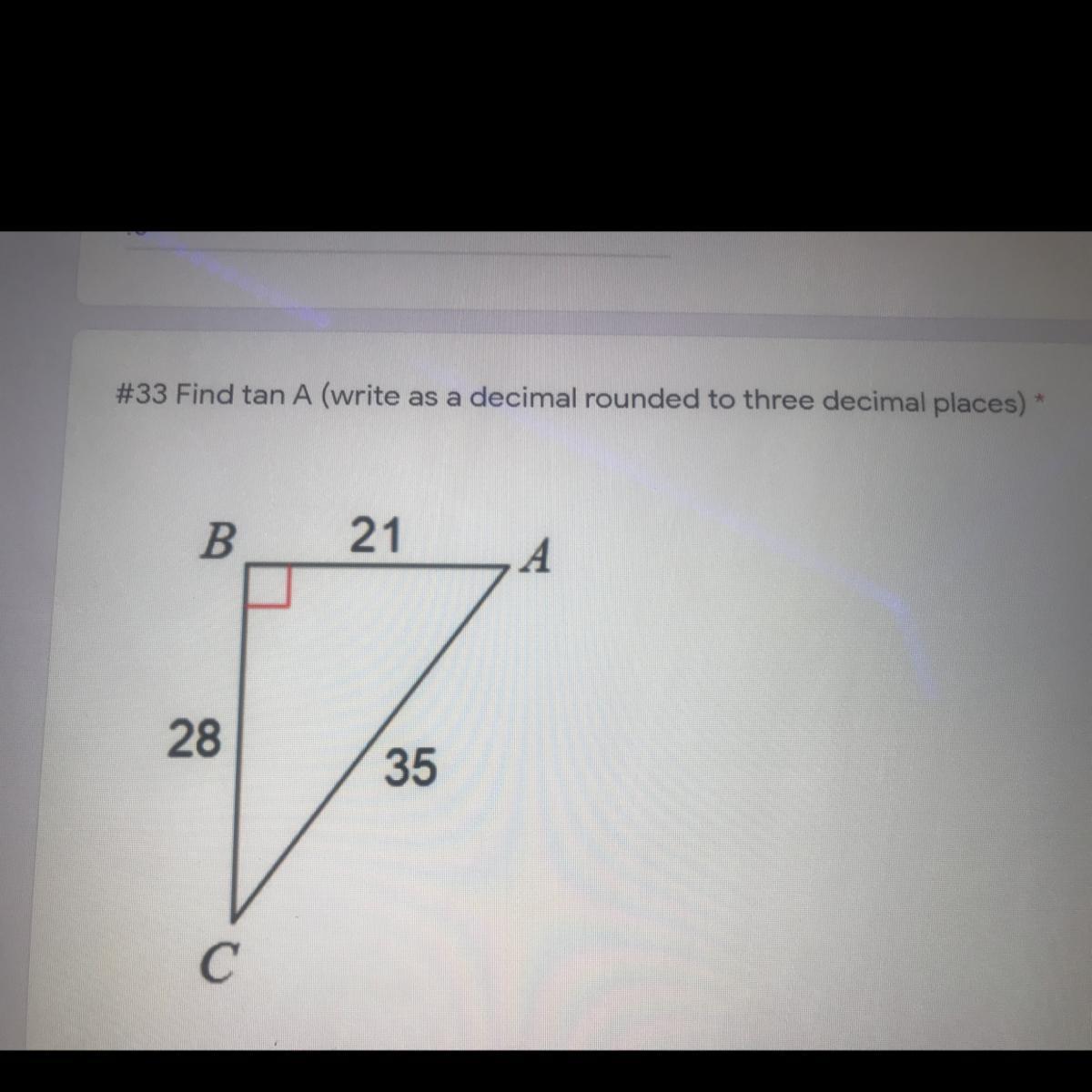 Find tan A ( write as a decimal rounded to the three decimal places) FIRST ANSWER GETS BRAINIEST