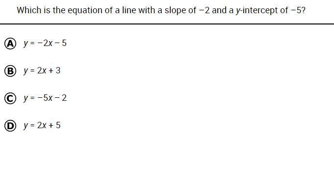 Using the linear equation y=mx+b, you are given m (the slope) and b (the y-intercept). m=2 and b=-8. Therefore, y=2x-8