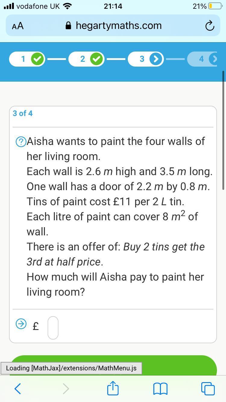 3. Because of the price offer on the paint, Aisha will pay full price for the first two tins, half price for the 3rd tin. That is, she will pay 2 1/2 times the full price of a tin when she buys the 3 tins of paint she needs. Each tin costs £11, so Aisha will pay ...