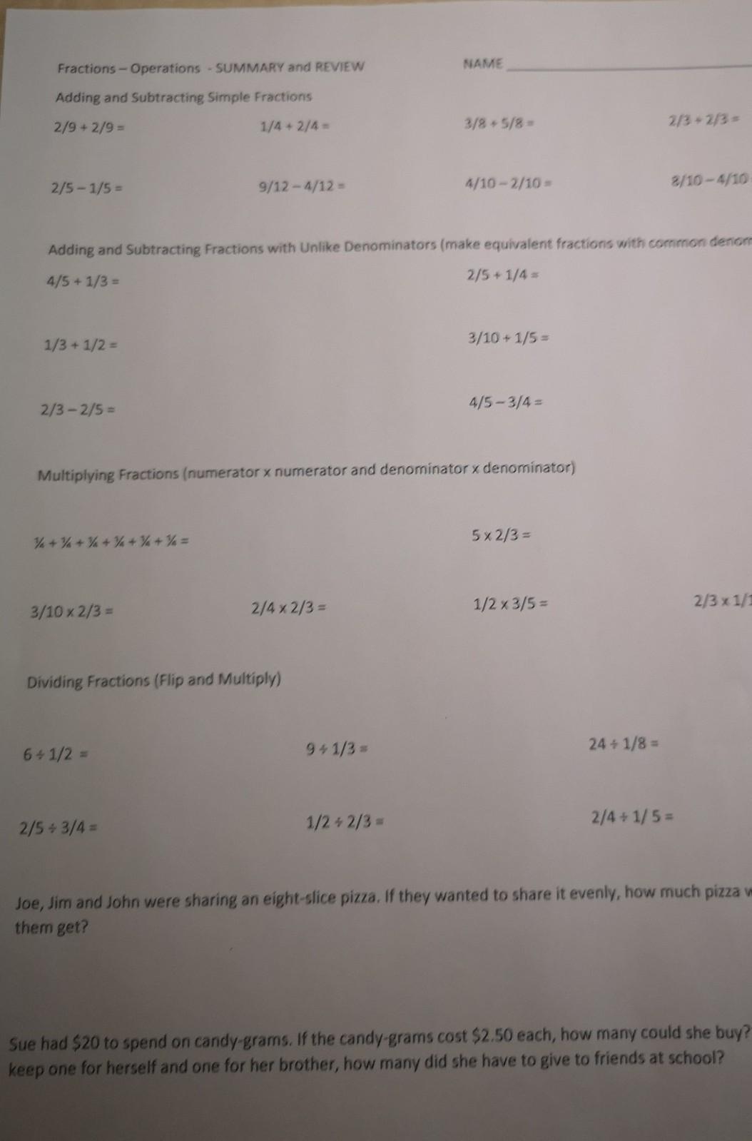 Adding and Subtracting- just add/subtract (depending on what the question is asking you) the numerators (top number), don't do anything to the denominators (bottom numbers)