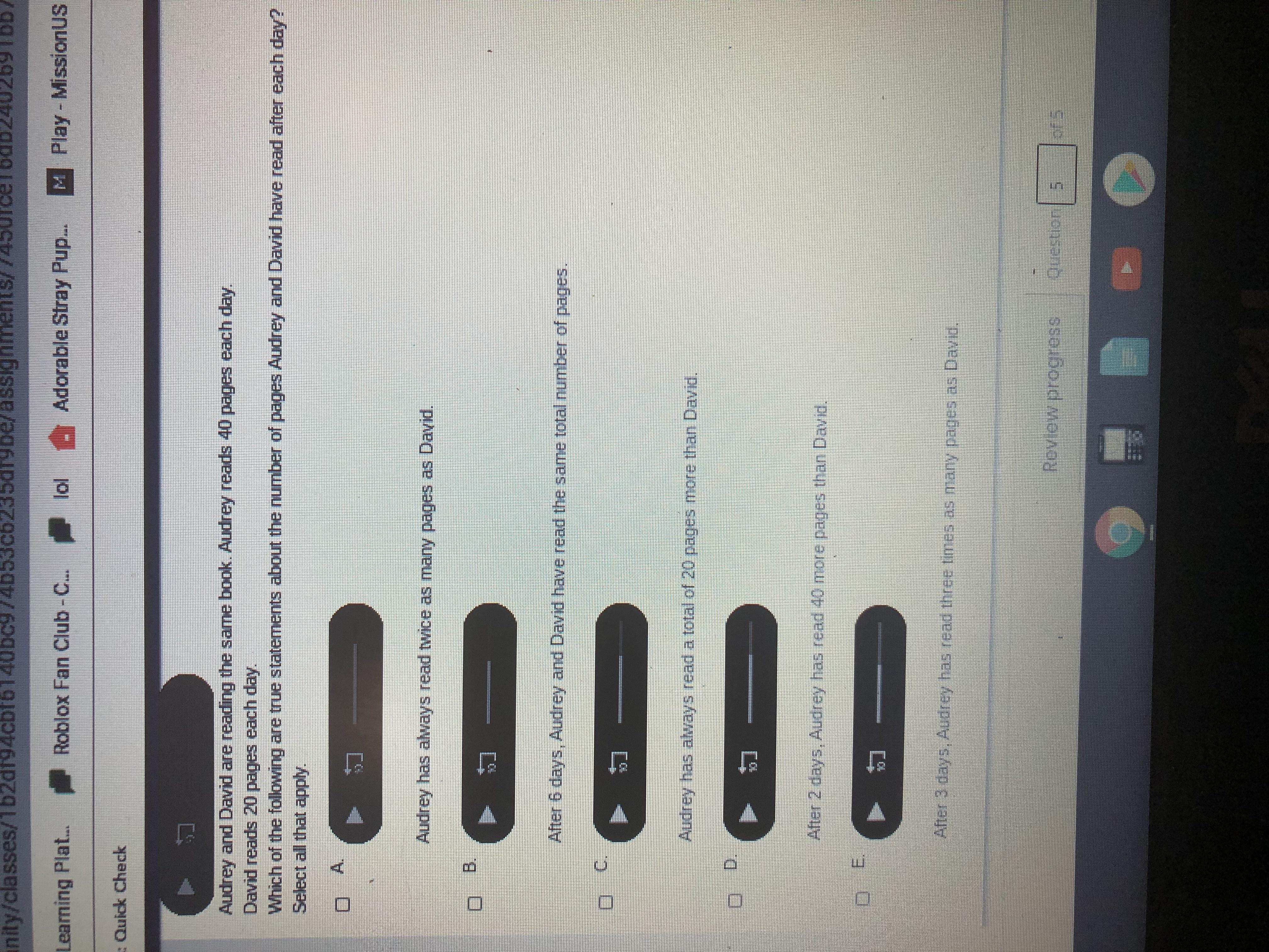 B is not correct because after 6 days, Audrey reads 240 pages, and David reads only 120. We can figure this out by multiplying the pages read by 6.