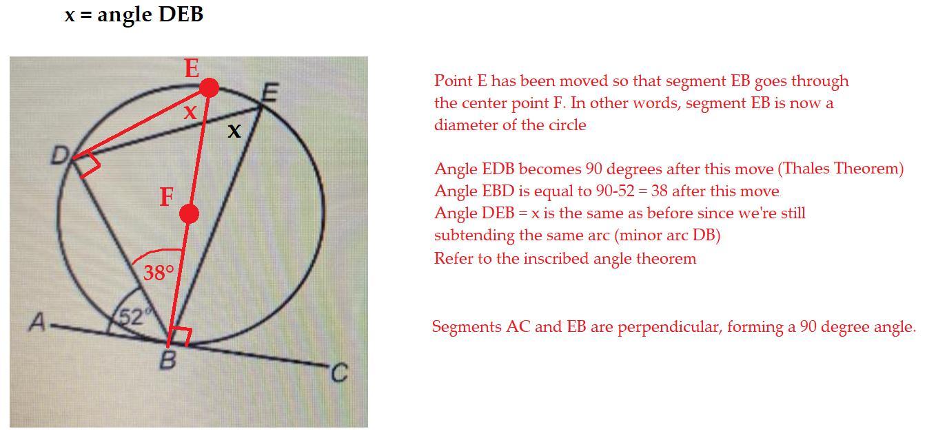 In short, the tangent-chord theorem says that inscribed angle DEB and angle ABD are the same measure (both are 52 degrees).