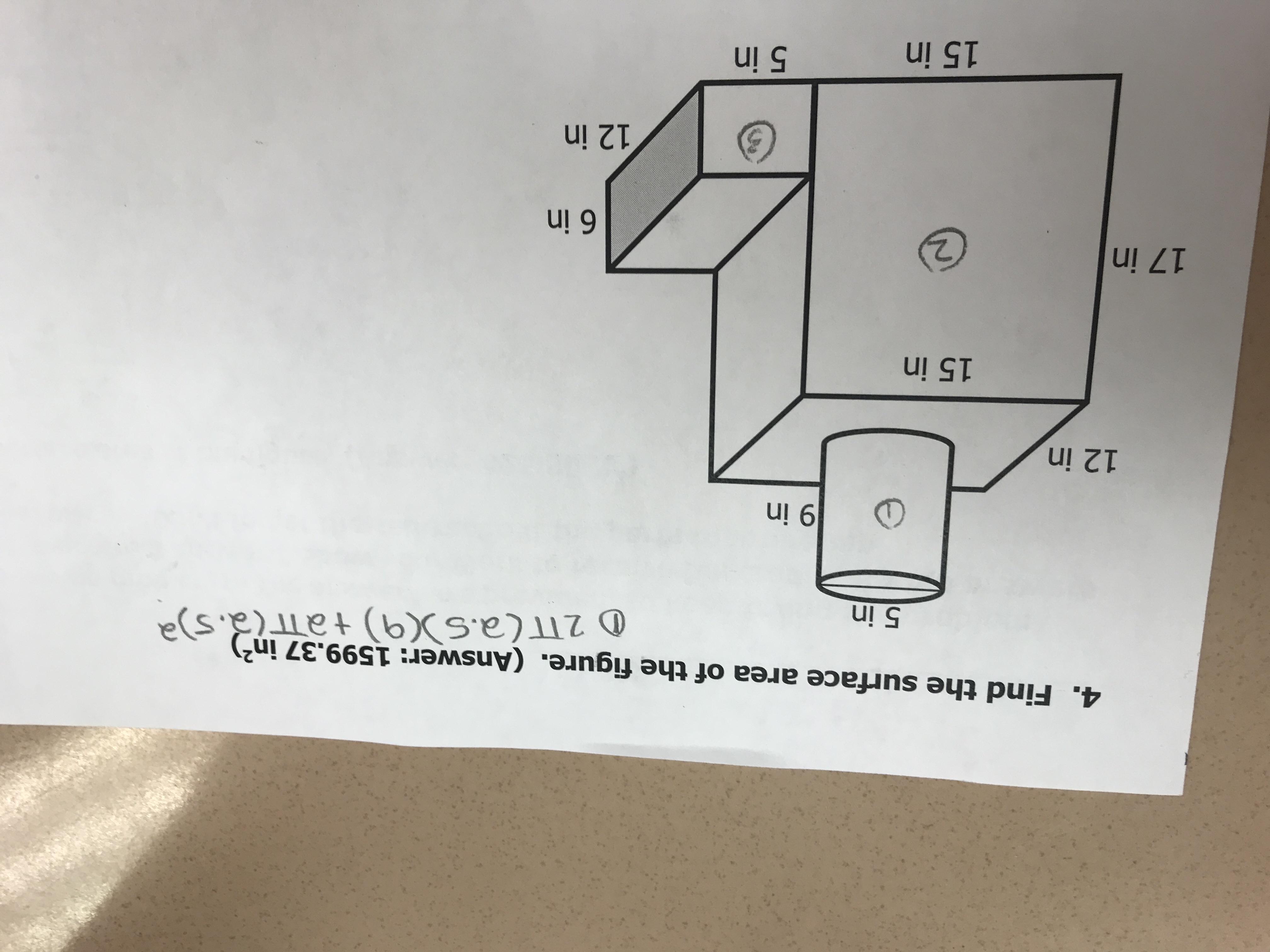 total surface area = 45π + 510 + 408 + 60 + 120 + 360 ≅ 1,599.37 in²