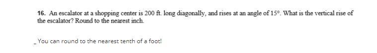 Create a right triangle with the hypotenuse = 2400in (same as 200ft) and angle from horizontal =15 degrees