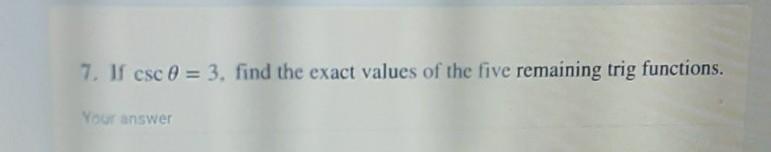 Step-by-step explanation: We know that csc is a reciprocal of sinθ so csc3 is sin 1/3. Then draw the right triangle HYP=3 OPP=1 ADJ= =