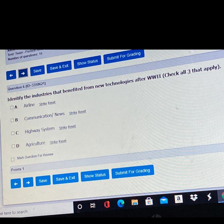 The Second World War was a mainly European warlike confrontation that allowed technological development in various fields, this was because countries considered that technological innovation was a valuable weapon to impose themselves on their enemies. Therefore, fields such as communication were deeply developed, secret and encrypted means of communication were created to plan attacks. Another of the fields developed was transportation, among which air and land stand out since it allowed the mobilization of large quantities of supplies and the army over great distances. These technological developments allowed the communication, aviation, and land transportation industries to perform better after the end of World War II. So the correct answers are the A. Airline, B. Communication / News, C. Highway system.