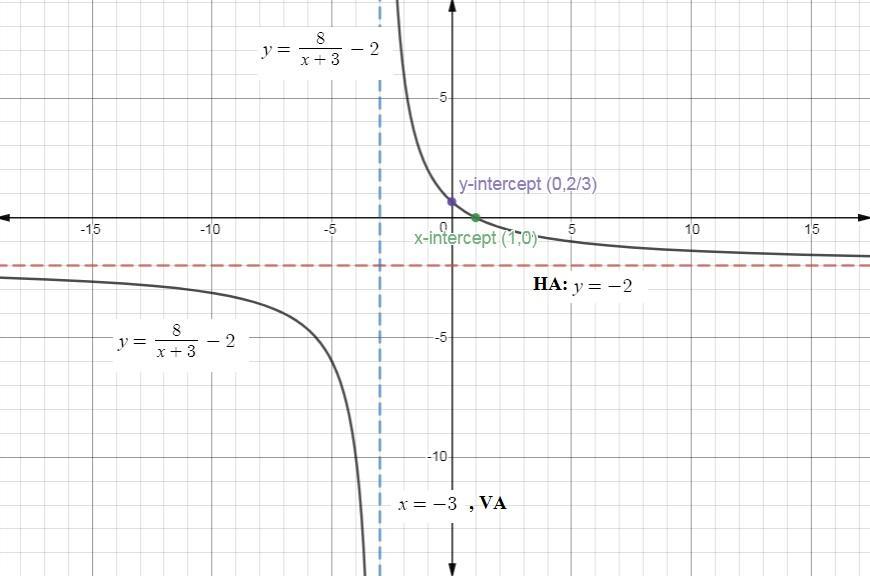 Sketch the asymptote and graph the function y=8/(x+3)-2