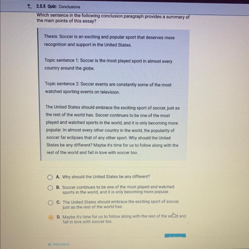 Since the paragraph is talking about how popular soccer is and how it's becoming the most watched and played I would think it's B. Good luck!