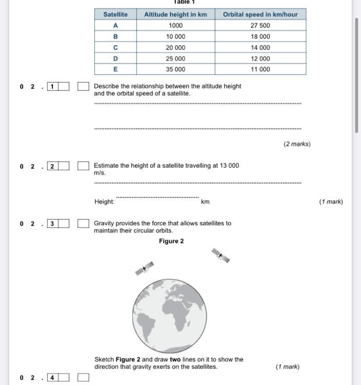 (1) From the given data table, as the altitude increases, the orbital velocity decreases, therefore, the relationship between altitude, 'h', and orbital velocity, '