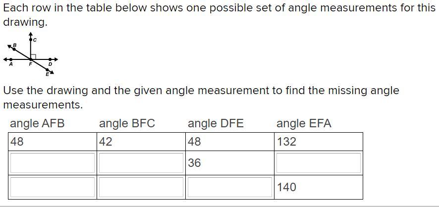 Angles AFB and DFE are congruent since they are vertical angles. For row 1, we have both of these angles equal to 48 degrees.