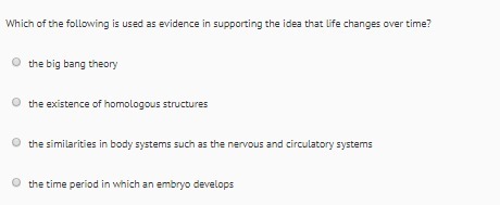 3. The answer is B. They are evidence that all came from a common ancestor that life changed over time. Homologous structures, like I explained above, are like similar structures, but they may have different structures. Basically, it suggests that these organisms came from a common ancestor that had the structure, and it changed over time for all these organisms to be able to exist in their niche.