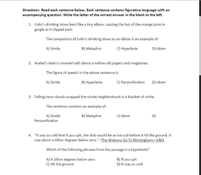 3. d) personification was used when the writer wrote that the <em>snow wrapped</em> the neighborhood with a blanket of white, which tells us that the writer is giving the snow human qualities.