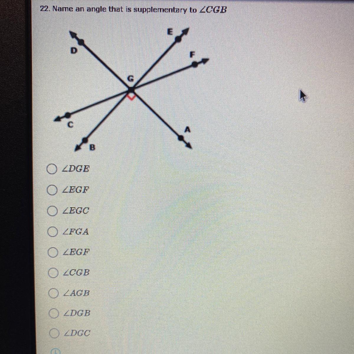 Name an angle that is supplementary to O ZDGE O ZEGF O ZEGC O ZFGA O ZEGF O ZCGB O ZAGB O ZDGB O