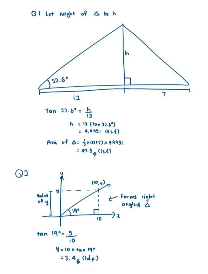 Hello, for the second question, you can actually form a triangle from the line. From there, you can see the height (aka y) will be easier to solve. I hope this helps!