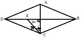 Since the diagonals of a rhombus intersect to form right angles, this means that angle ACE is 26 degrees. Since CE is the angle bisector of ACD, this means that ACD is 26 x 2 = 52 degrees. The diagonals are angle bisectors to the opposite corners, so ACD = ACB = 52 degrees, and BCD = 52 x 2 = 104 degrees. For a rhombus, opposite angles are equivalent, so BAD = BCD = 104 degrees.