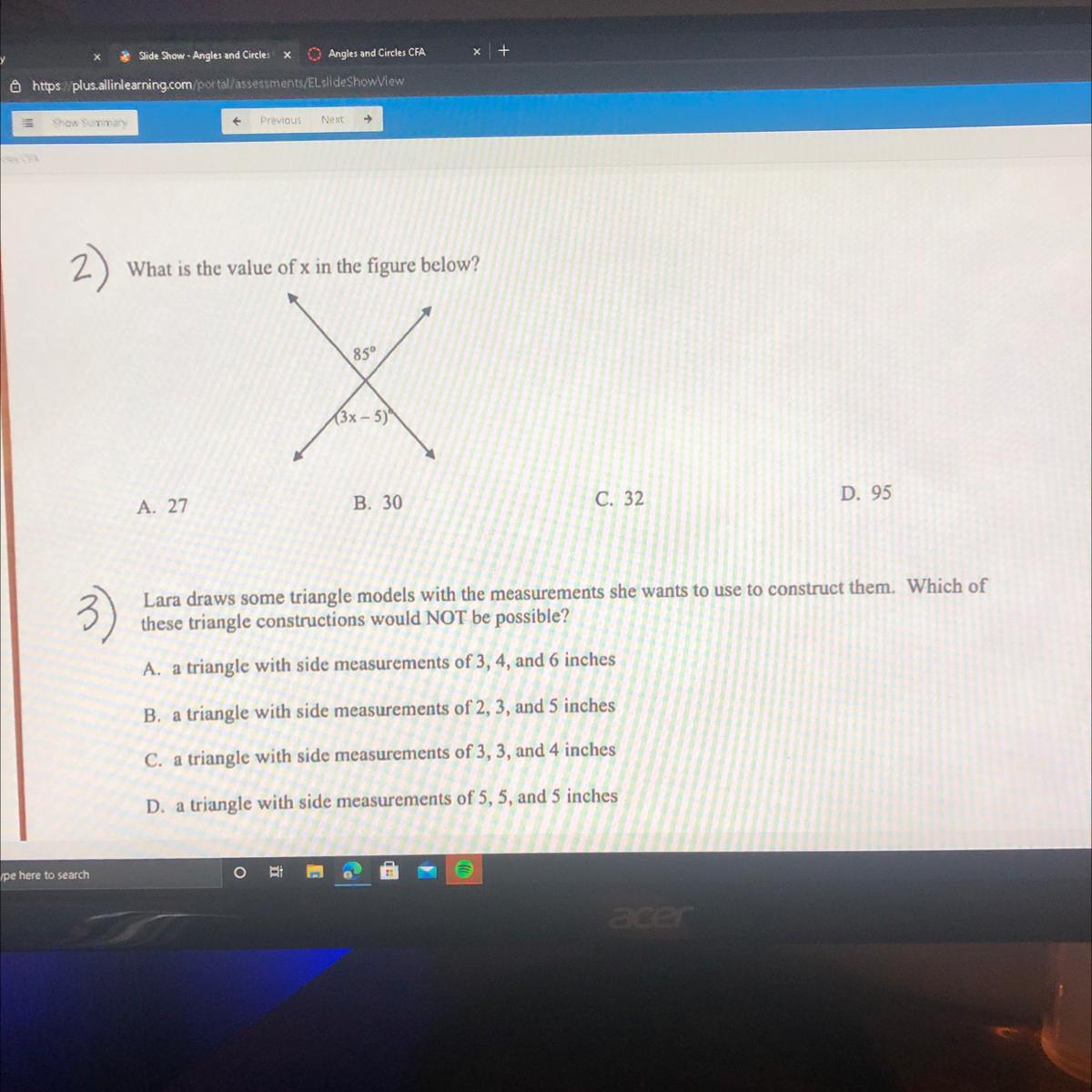 2) 85° = (3x - 5)° <em>[</em><em>Vertically</em><em> </em><em>Opposite</em><em> </em><em>Angles</em><em>]</em>