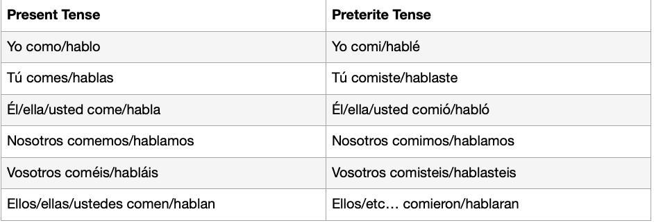 Compare the preterite tense conjugations to the present tense conjugations for an AR verb (hablar) as well as an ER/IR verb (comer) in this chart. Pay particular attention to the endings in the tú, nosotros, vosotros, and ellos/ellas/ustedas forms. What do the present and preterite endings for those subjects have in common? Do these patterns hold true for irregular verbs as well?