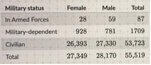 Mavis is interested whether military status is related to gender in American Samoa. The data she collected about the population of American Samoa in 2010 is below.