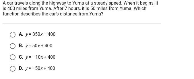 so we first have to find the y-intercept or "b" in the question it states that they started off 400 miles away so that would be the "b" then you would need to find the m or slope and in the question it says after seven hours they where 50 miles away and 400 minus 50 is 350 so they traveled 350 miles in 7 hours so you then have to divide 350 by 7 and you get the slope 50 but since it is to find out how far away they are we make it negative giving you the equation y = -50 +400. Hope you found this helpful :D