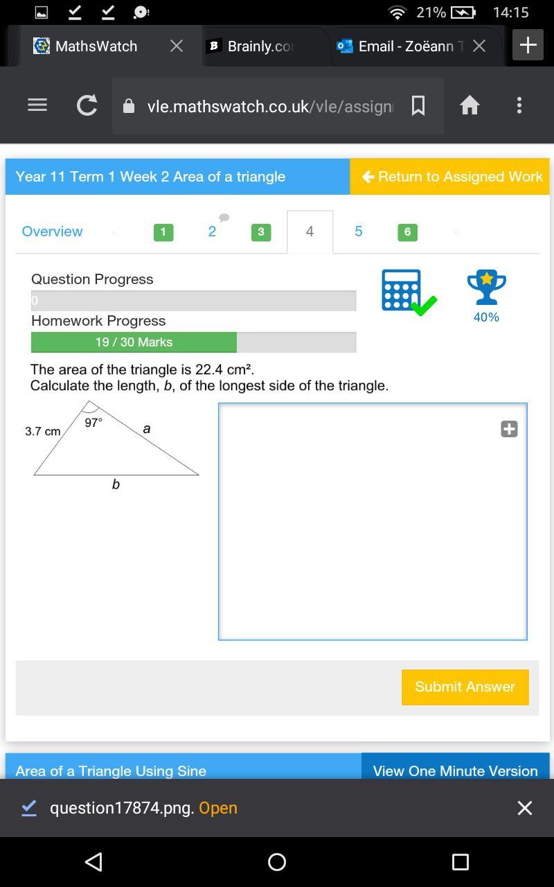 A = 22.4 = 1/2 × 3.7 × a × sin(97°)
