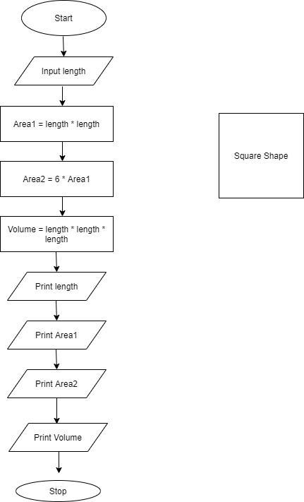, the surface area of the whole cube and the volume of the cube are calculated; the program then prints the user input (length) and each of the calculated parameters.