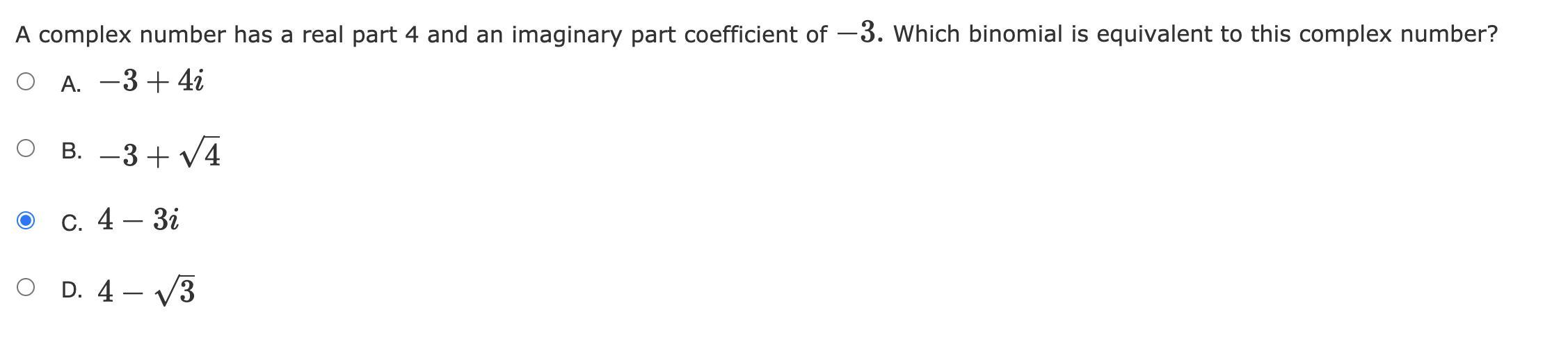 The binomial equivalent to the complex number is z = 4 - 3·i