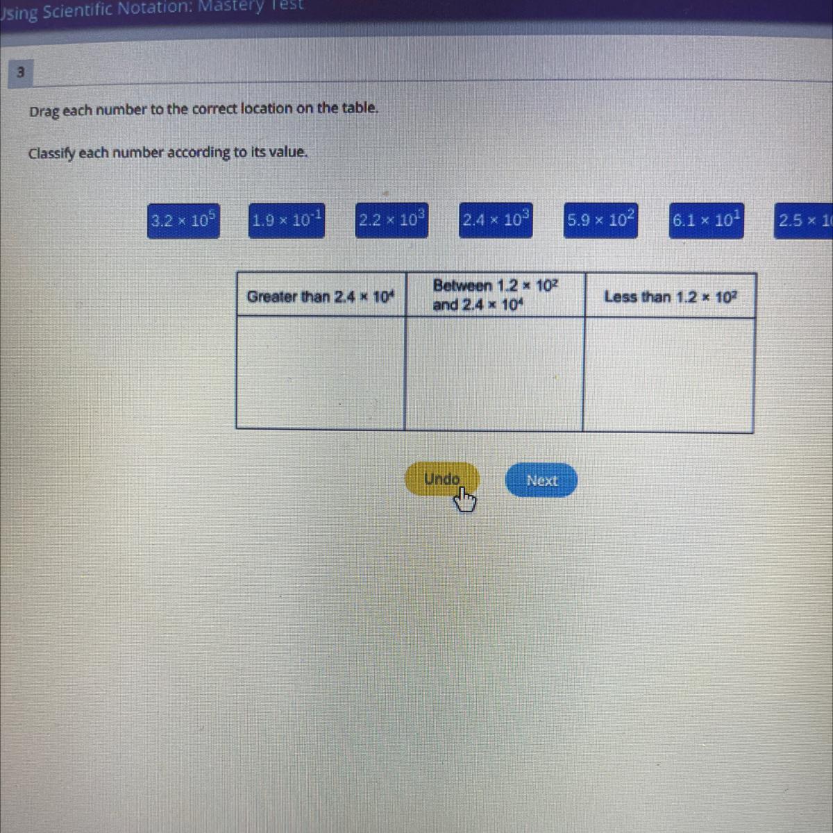 2.4 x 10^3 goes in between 1.2 x 10^2 and 2.4 x 10^4